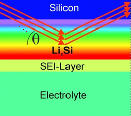 „Mit den Neutronenexperimenten und weiteren Messungen konnten wir beobachten, wie sich beim Aufladen an der Siliziumoberfläche eine blockierende Schicht bildet, die das Eindringen von Lithium-Ionen behindert“, erläutert der HZB-Physiker Dr. Sebastian Risse. Diese Schicht besteht aus organischen Molekülen aus der Elektrolyt-Flüssigkeit und anorganischen Bestandteilen. Beim Aufladen löst sich diese 30-60 Nanometer dünne Schicht teilweise wieder auf, sodass die Lithium-Ionen in die Silizium-Anode eindringen können. Für das Auflösen der Schicht wird jedoch Energie benötigt, die dann nicht mehr zur Speicherung zur Verfügung steht. Die Physiker verwendeten die gleiche Elektrolyt-Flüssigkeit, die auch in kommerziellen Lithium-Batterien genutzt wird.