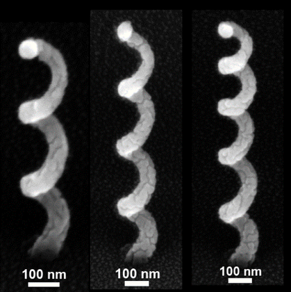 Die Nanostrukturen aus dem HZB-Team um Katja Höflich sind wie Korkenzieher geformt, sie bestehen aus Silber und sind etwa 100 Nanometer dick. Mathematisch lässt sich jede Nano-Antenne als nahezu eindimensionale Linie betrachten, die zu einer Helix verschraubt ist und durch Parameter wie Durchmesser, Länge, Windungszahl und Drehsinn der Helix gekennzeichnet werden kann.