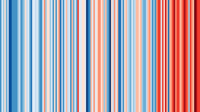 Die Grafik visualisiert die Durchschnittstemperatur für Deutschland zwischen 1881 und 2017; jeder Streifen steht für ein Jahr, Basis ist der Datensatz des DWD. © Ed Hawkins/klimafakten.de