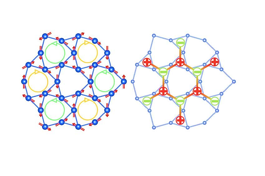 Im Kagome-Muster können sich die Spins benachbarter Atome nicht wie üblich jeweils gegenläufig zueinander ausrichten. Stattdessen gibt es zwei zulässige Spin-Konfigurationen: Entweder zeigen die Spins von zwei der drei Atome genau zum Dreiecks-Zentrum, die des dritten dagegen aus dem Zentrum heraus. Oder es ist genau umgekehrt: Ein Spin zeigt zum Zentrum, die beiden anderen aus ihm heraus. Dies beschränkt die Möglichkeiten der Spin-Anordnungen – daher auch der Name „Kagome-Spin-Eis.“ Eine Folge davon ist, dass sich dieses System so verhält, als ob in ihm magnetische Monopole vorliegen würden.