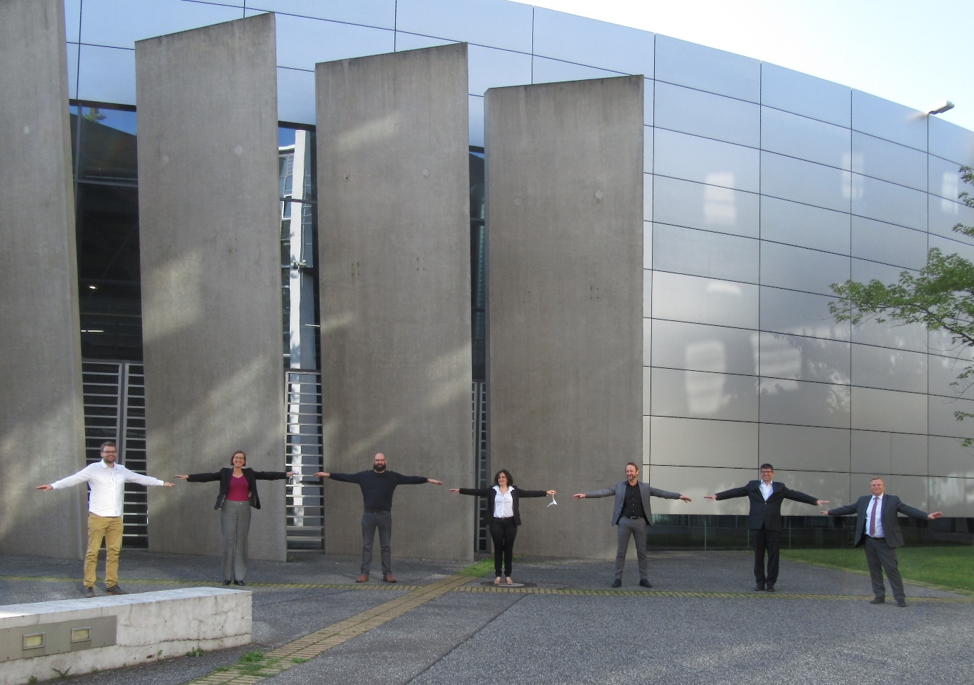 Die Teilnehmer nach der Unterzeichnung des Kooperationsvertrags zwischen IKZ und HZB in Corona-konformen Abstand: (von links nach rechts) Dr. Andreas Popp (IKZ), Dr. Manuela Urban (FVB), Dr. Peter Gaal (IKZ), Prof. Dr. Catherine Dubourdieu (HZB), Prof. Dr. Thomas Schröder (IKZ), Prof. Dr. Bernd Rech (HZB), Thomas Frederking (HZB). © Sandra Fischer/HZB