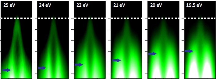 Der Dirac-Kegel ist typisch für Topologische Isolatoren und auf allen 6 Bildern praktisch unverändert (ARPES-Messungen an BESSY II). Der blaue Pfeil zeigt zusätzlich die Valenzelektronen im Volumen. Das Synchrotronlicht tastet beide ab und kann so den Dirac Kegel an der Oberfläche (elektrisch leitend) vom dreidimensionalen Volumen (isolierend) unterscheiden.
