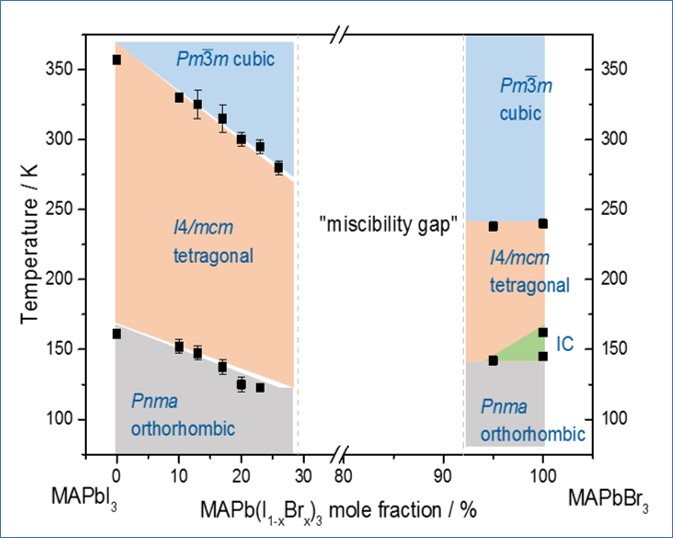 The HZB paper focuses on the systematic characterisation of hybrid perovskites containing mixed halides (MAPb(I,Br)3). The samples of the mixed crystals were produced in powder form using a solvent-based synthesis method. The research team from HZB’s Department Structure and Dynamics of Energy Materials (SE-ASD) showed that the crystal structure of the mixed crystal compounds is temperature dependent. As the materials go through different phase transitions, they form either a tetragonal or a cubic perovskite structure depending on the temperature and chemical composition. Now, a comprehensive T-x phase diagram has been created for this solid solution series for the first time. It was revealed that the phase transition temperature of the iodine-rich mixed crystals drops as iodine content increases, which stabilises the cubic perovskite structure at room temperature.