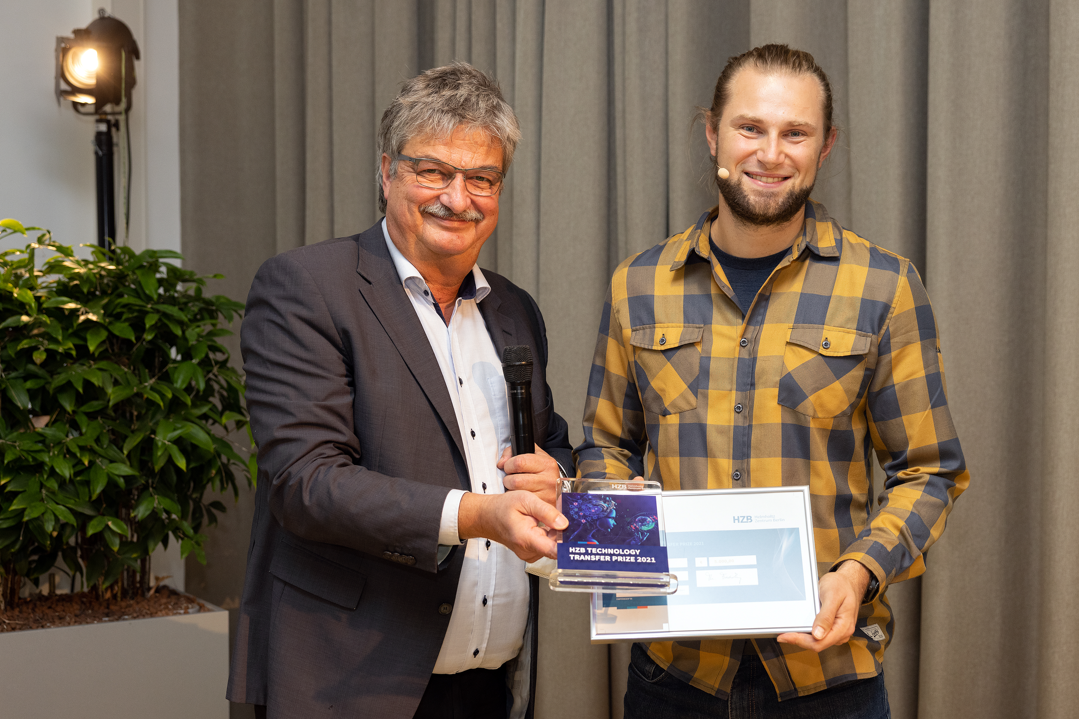 Maximilian Fleischer, Sprecher des Industriebeirates und Tobias Henschel, Gewinner des HZB Technologietransferpreises 2021.