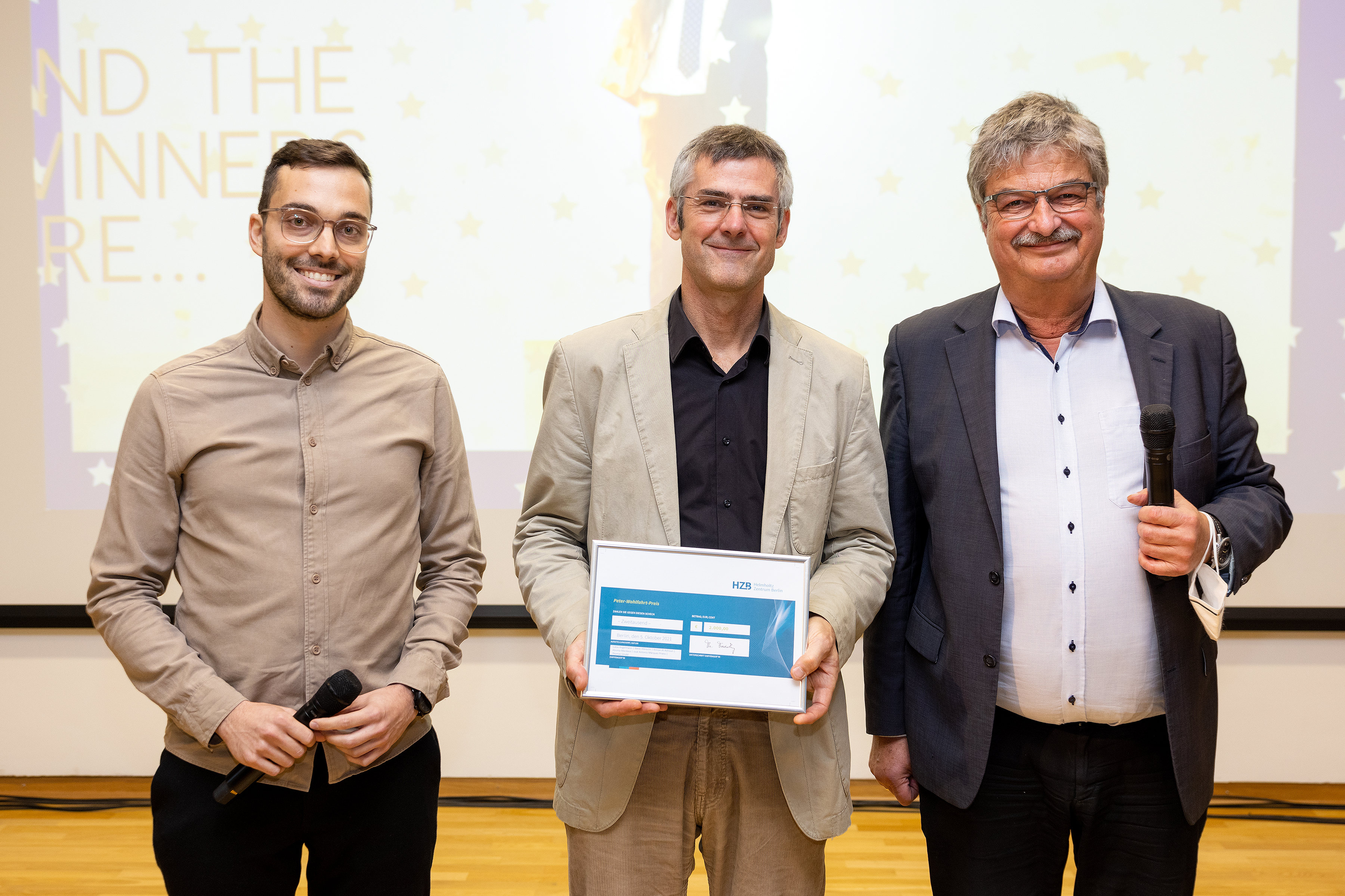 Die Gewinner des Peter Wohlfart-Preises: Lukas Kegelmann und Thomas Unold (von links) mit Maximilian Fleischer, Sprecher des Industriebeirates. © HZB / M. Setzpfand