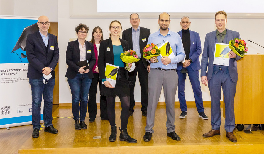 Am 17. Februar 2022 wurde zum 20. Mal der Dissertationspreis Adlershof verliehen. Dr. Amran Al-Ashouri (3.v.r.) aus der HZB-Nachwuchsgruppe „Perowskit-Tandemsolarzellen“ erhielt die mit 3.000 Euro dotierte Auszeichnung. Der Physiker erforscht, wie sich mithilfe neuer organischer Kontaktschichten hocheffiziente Perowskit-Silizium-Tandemsolarzellen optimieren lassen.