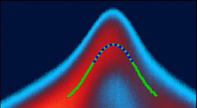 An BESSY II lässt sich diese Hypothese jedoch experimentell genau überprüfen. Mit winkelaufgelöster Photoemissions-Spektroskopie (ARPES) ist es möglich, die elektronischen Bandstrukturen abzutasten. Ein gewichtiger Anteil von Polaronen am Ladungstransport würde sich durch eine höhere Effektive Masse bemerkbar machen. ARPES misst die kinetische Energie der Elektronen, also 1/2 mv2 mit Masse m und Geschwindigkeit v und je "zäher" der Elektronentransport, desto höher die sogenannte "effektive" Masse m. Da der Impuls p=mv ist, entspricht die Formel einer Parabel E= (p2)/(2m), die direkt im Experiment gemessen wird (siehe Abbildung): je größer m, desto geringer die Krümmung der Parabel.