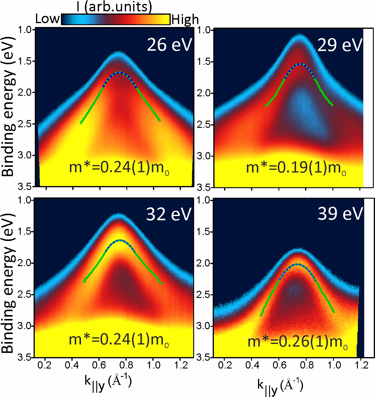 An BESSY II lässt sich diese Hypothese jedoch experimentell genau überprüfen. Mit winkelaufgelöster Photoemissions-Spektroskopie (ARPES) ist es möglich, die elektronischen Bandstrukturen abzutasten. Ein gewichtiger Anteil von Polaronen am Ladungstransport würde sich durch eine höhere Effektive Masse bemerkbar machen. ARPES misst die kinetische Energie der Elektronen, also 1/2 mv2 mit Masse m und Geschwindigkeit v und je "zäher" der Elektronentransport, desto höher die sogenannte "effektive" Masse m. Da der Impuls p=mv ist, entspricht die Formel einer Parabel E= (p2)/(2m), die direkt im Experiment gemessen wird (siehe Abbildung): je größer m, desto geringer die Krümmung der Parabel.