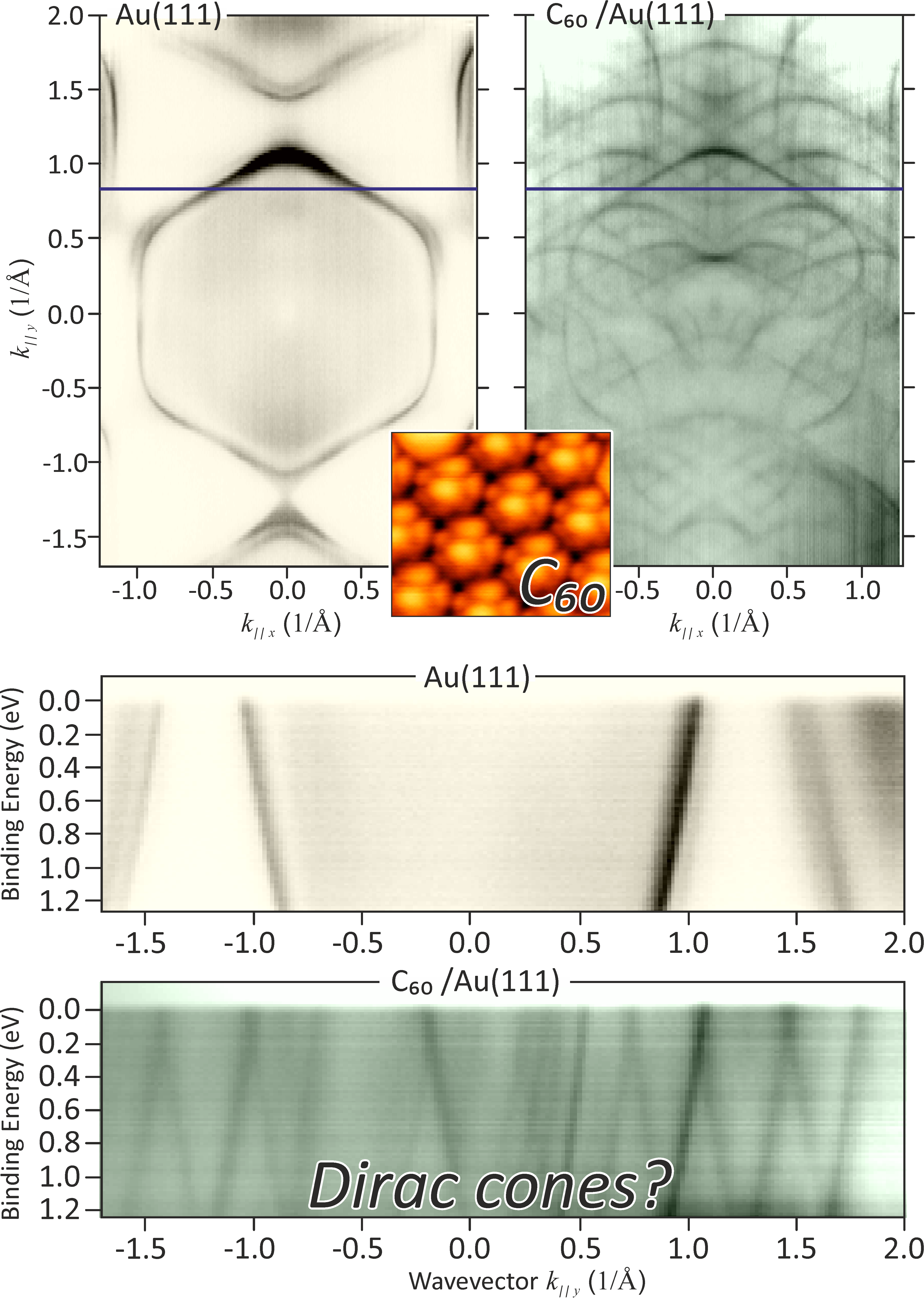 Messdaten von BESSY II vor und nach Deposition von Buckyballs auf Gold zeigen die Bandstrukturen und das Auftreten von kegelartigen Überkreuzungen. In der Mitte ist die Rasterelektronenmikroskopie der Buckyballs auf Gold eingeblendet.