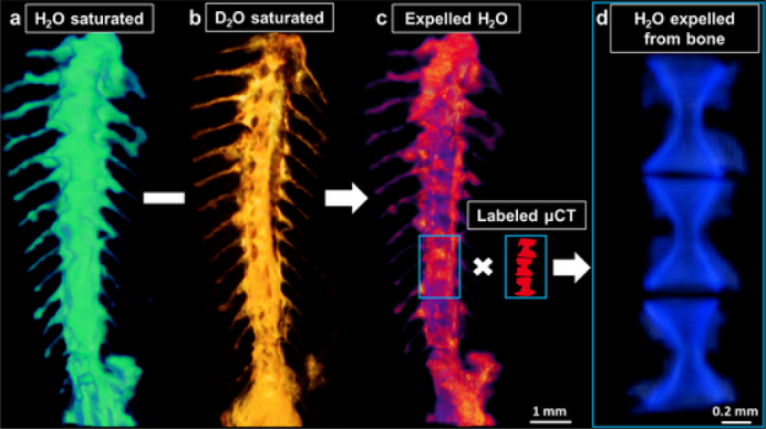 Um die Menge des eingelagerten Wassers zu bestimmen, nutzte das Team die Methode der Neutronentomographie am Berliner Experimentierreaktor BER II* am HZB: Dabei tauchten sie die Knochenproben zunächst in Wasser und durchleuchteten sie mit Neutronen, um sie anschließend in deuteriertem schwerem Wasser (D2O) zu sättigen. Aus den 3D-Daten dieser Neutronen-Tomographien konnte der Unterschied zwischen den beiden Knochenzuständen ermittelt werden. Das Team bestimmte so für jeden Wirbel der Wirbelsäule die genaue Menge des durch die Diffusion des D2O verdrängten Wassers. "Außerdem untersuchten wir Schnitte der Knochenproben, analysierten sie mit Elektronenmikroskopie und Mikro-CT und bestimmten die PG-Konzentration mit Raman-Spektroskopie", erklärt Silvera.