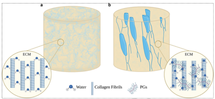 Die Skizze zeigt schematisch das Modell für die Wasserdurchlässigkeit in a) Knochen ohne Knochenzellen: Wasser ist nur lose an die organischen Bestandteile der extrazellulären Matrix gebunden. b) Im Knochen mit Knochenzellen:  Wasser diffundiert kaum durch die Knochenmatrix, da es von PGs zurückgehalten wird, und daher fließt Wasser hauptsächlich innerhalb von LCN, um ein Mechanosensoriksystem des Knochens zu aktivieren.