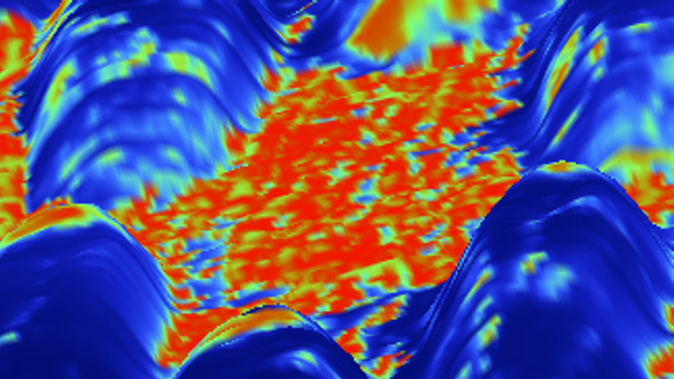 Mit der neuen Methode wurde die Oberfläche eines bimetallischen Katalysatormaterials in einem wässrigen Medium abgerastert. Die Abbildung zeigt eine Überlagerung des Stromsignals auf eine dreidimensionale Darstellung des Höhenbildes. Dabei sind inselartige Bereiche zu erkennen.
