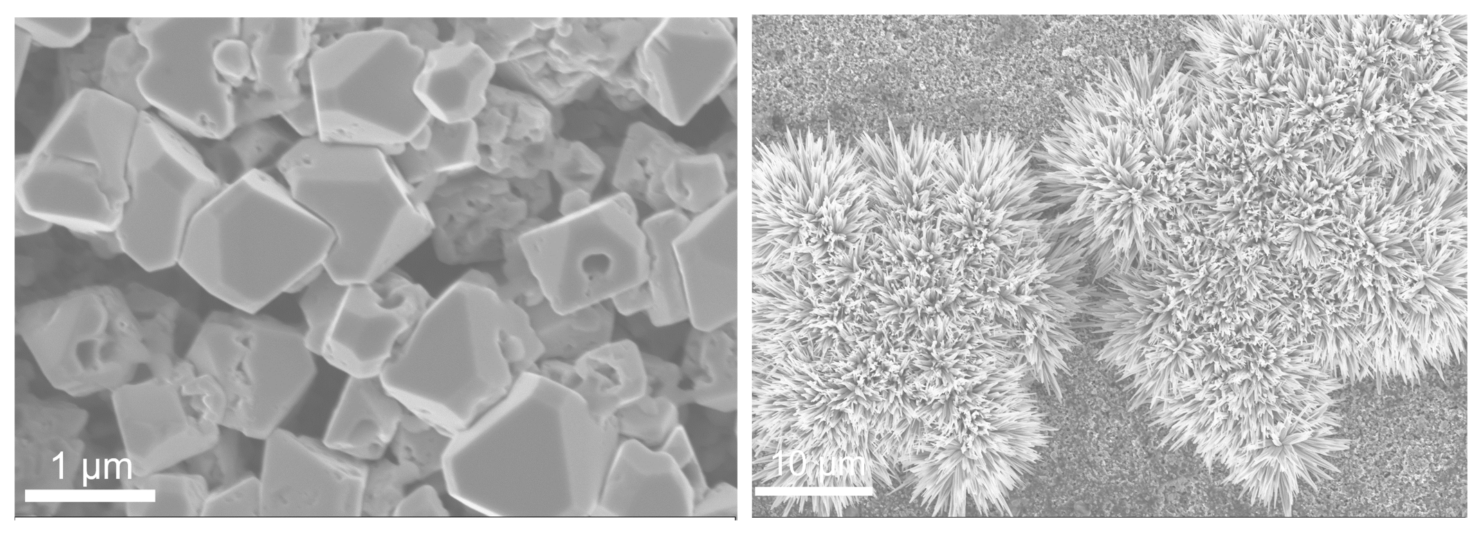 Dennoch gelangen Kalium-Ionen aus dem Elektrolyten durch die Membran und bilden winzige Kristalle an der Kathode, die die Poren verstopfen. „Das sollte nicht passieren“, sagt Flora Haun, Doktorandin im Team von Matthew Mayer. Mit Rasterelektronenmikroskopie und weiteren Charakterisierungsmethoden hat das Team den Prozess der Kristallbildung an der Kathode eingehend untersucht, wobei sie systematisch die Konzentration des Elektrolyten variierten.
