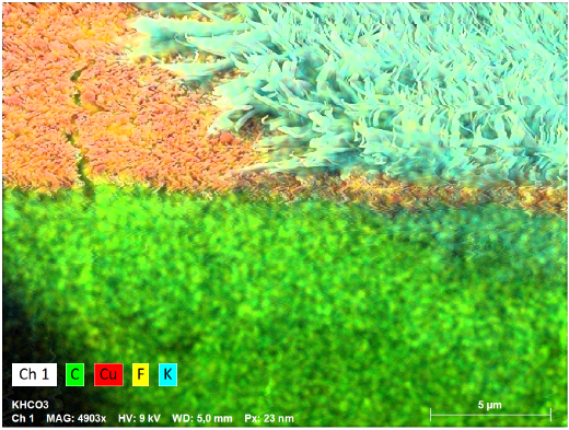 Die EDX-Messung zeigt, dass sich bei höherer Konzentration von gelösten Kaliumverbindungen im Elektrolyten Kalium-Kristalle an der Kathode (rechts oben) ablagern. © HZB