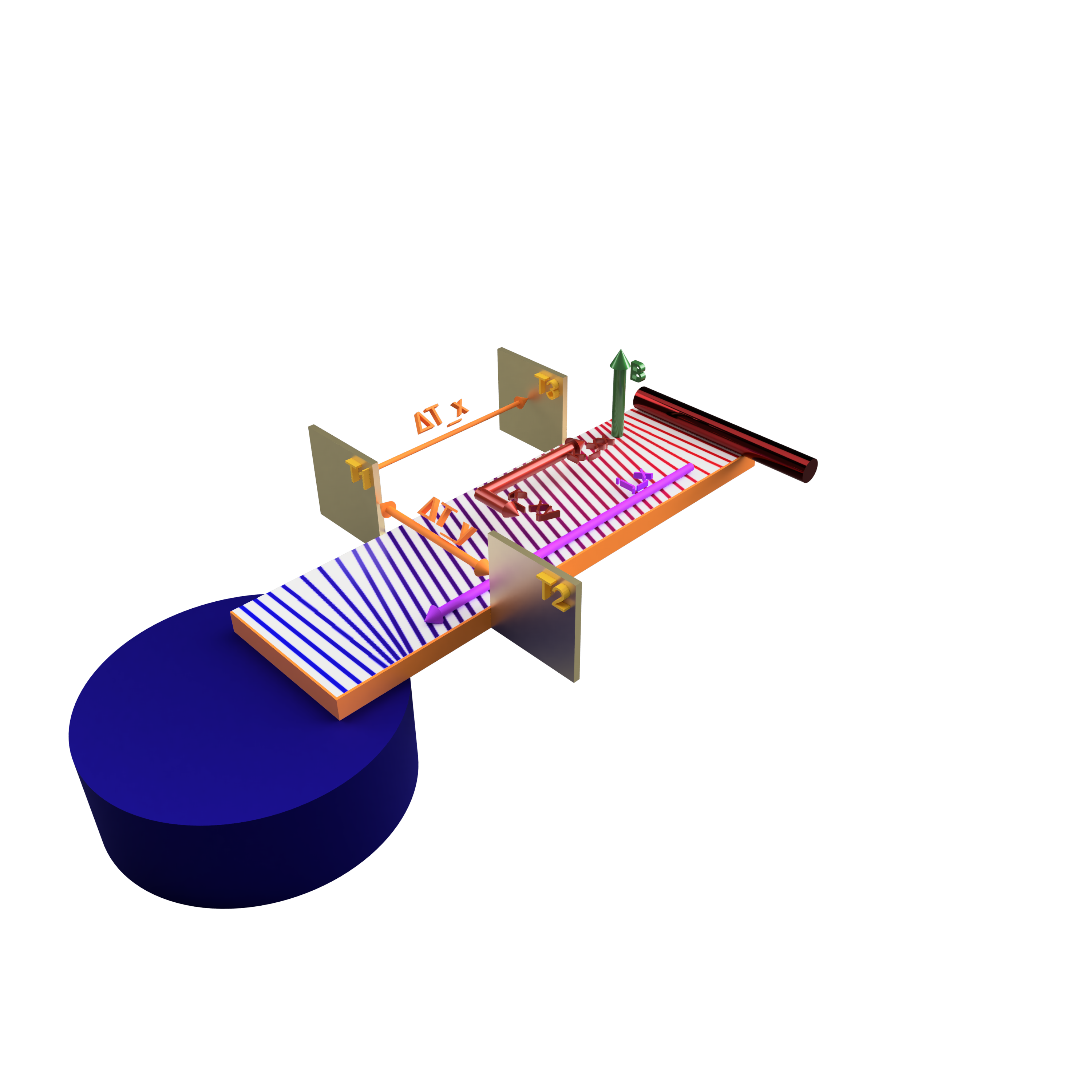 Der thermische Hall-Effekt (THE) spielt eine Schlüsselrolle, um exotische Zustände in kondensierter Materie zu identifizieren. Dabei handelt es sich um eine winzige Wärmedifferenz, die quer zu einem angelegten Temperaturgradienten entsteht, sobald ein senkrechtes Magnetfeld die Probe durchdringt (siehe Abbildung 2). Insbesondere ermöglicht die quantitative Messung des thermischen Hall-Effekt es, die exotischen Anregungen von konventionellem Verhalten zu trennen. Der thermische Hall-Effekt wird in einer Vielzahl von Materialien beobachtet, darunter Spin-Flüssigkeiten, Spin-Eis, Mutterphasen von Hoch-Temperatur-Supraleitern und Materialien mit stark polaren Eigenschaften. Allerdings sind die Wärmedifferenzen, die senkrecht zum Temperaturgradienten in der Probe entstehen, extrem winzig: Für typische millimetergroße Proben liegen sie im Bereich von Mikrokelvin bis Millikelvin. Bisher war es schwierig, diese Wärmedifferenzen experimentell zu erfassen, weil die eingetragene Wärme durch Mess-Elektronik und Sensoren den Effekt überdeckten.