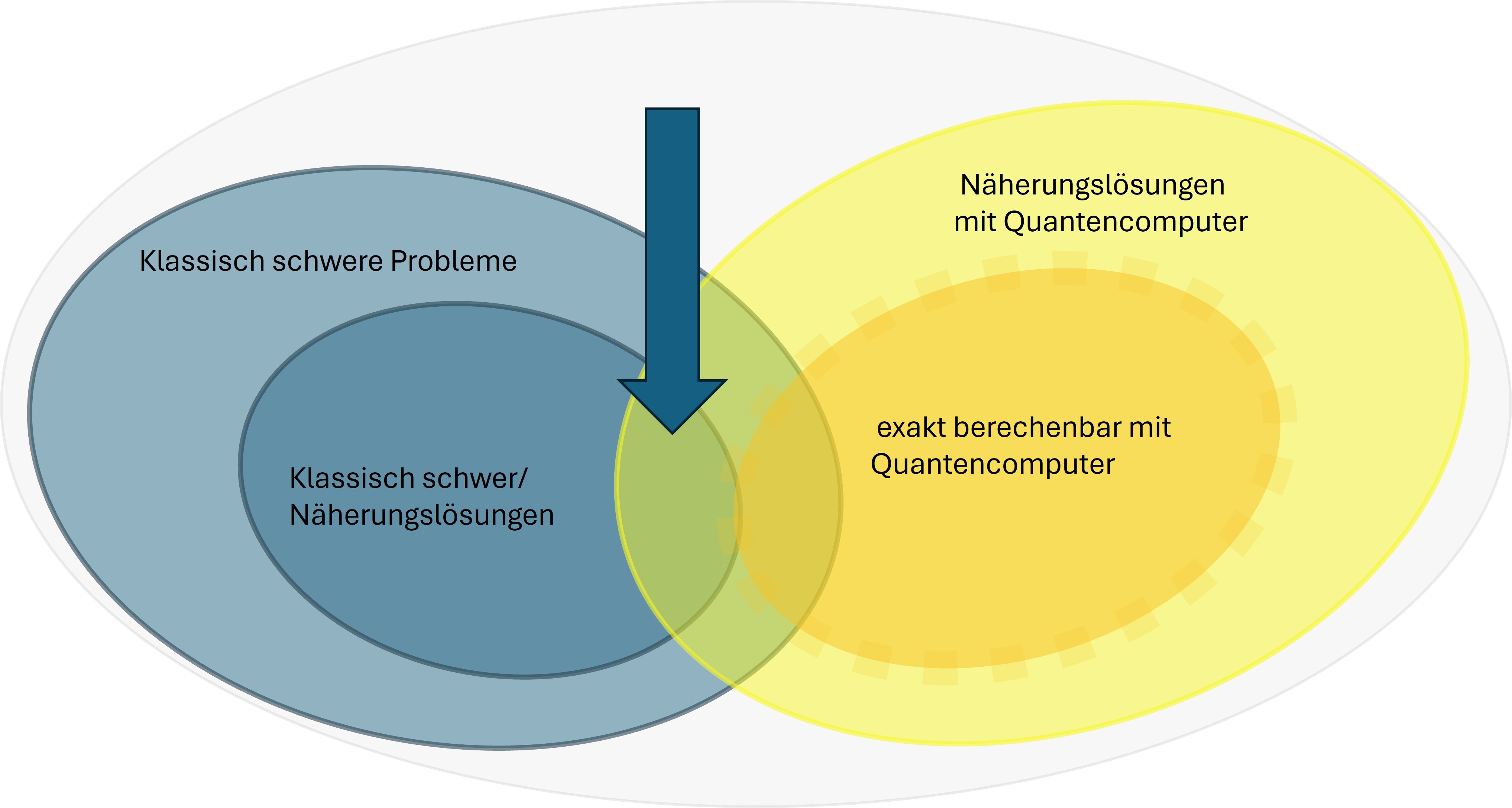 Die vorliegende Arbeit (Pfeil) zeigt, dass ein bestimmter Teil der kombinatorischen Probleme mit Quantencomputern sehr viel besser lösbar ist, möglicherweise sogar exakt.