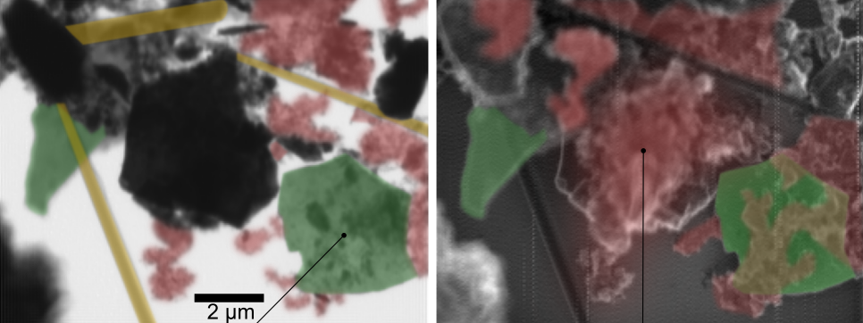 Aufnahmen einer zerlegten Li-Ionen-Batterie mit zyklischer MXene-Elektrode (grün), Elektrolyt/Karbonat-Spezies (rot) und Separator (gelb). Mehr Erläuterungen zur Bildgebung finden sich in der Publikation.