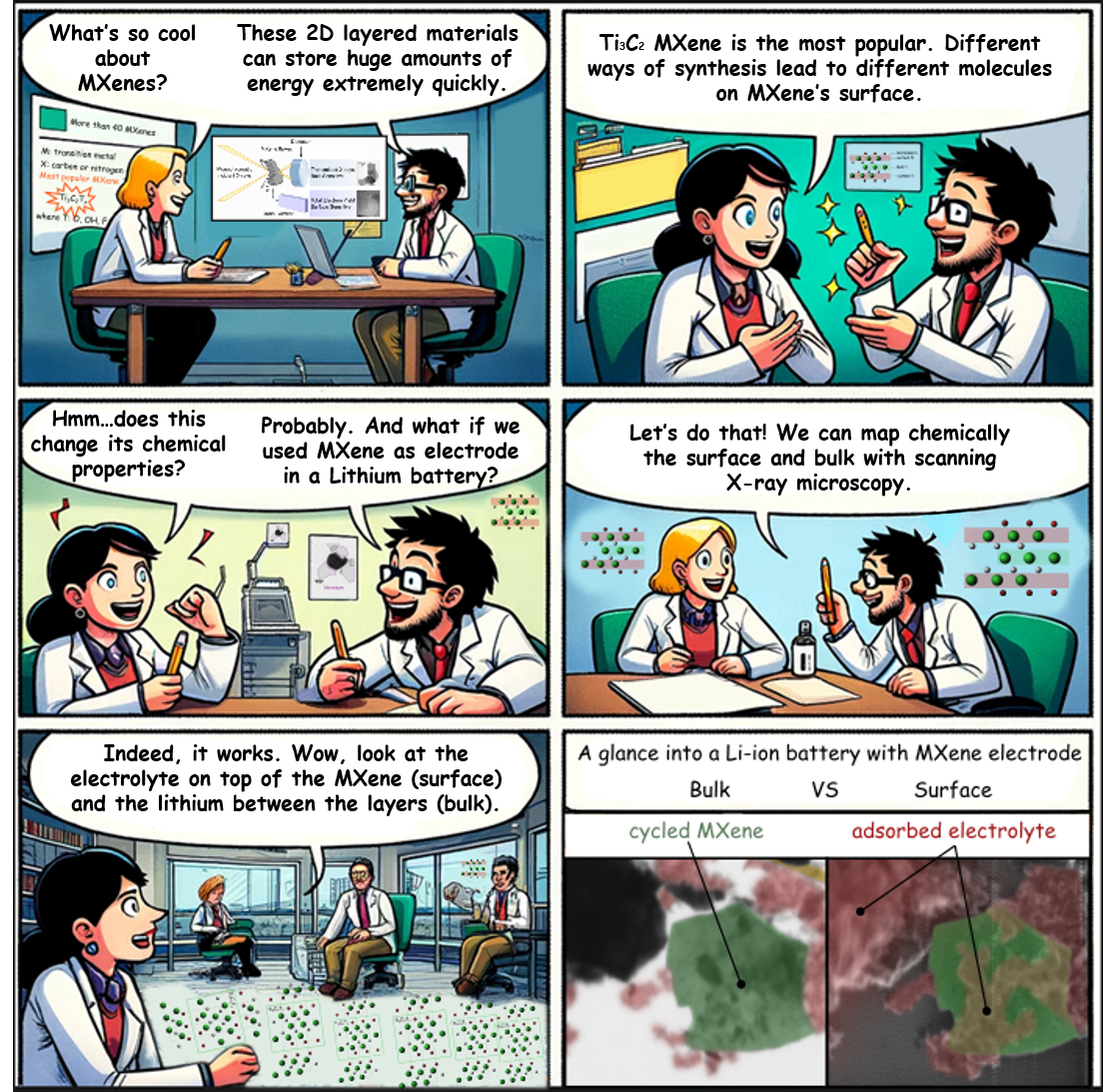 Was ist das Besondere an den MXenen und warum ist die neue Methode so wertvoll? In wenigen Bildern schafft der kurze Cartoon es, diese Fragen zu beantworten. Erstellt wurden die Bilder mit Hilfe von ChatGPT. © Faidra Amargianou/ChatGPT
