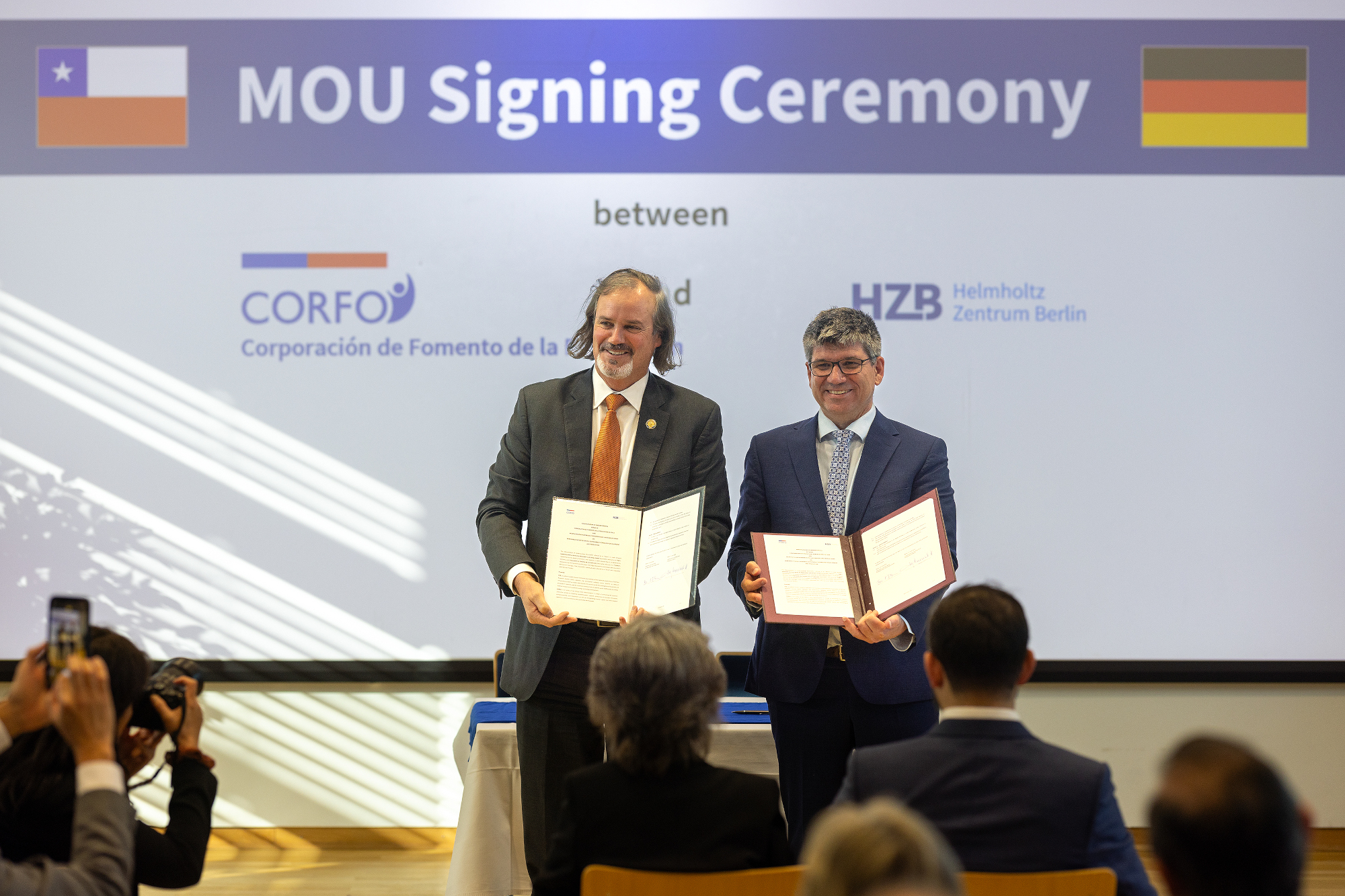 Während des Besuchs wurde ein Memorandum of Understanding zwischen der CORFO (Corporación de Fomento de la Producción, auf Deutsch: Gesellschaft für Produktionsförderung*) und dem HZB unterzeichnet. José Miguel Benavente, geschäftsführender Vizepräsident von CORFO, und Bernd Rech, wissenschaftlicher Geschäftsführer des HZB, zeigten sich erfreut über die zukünftige Zusammenarbeit. Zweck dieser Absichtserklärung ist es, Wege für neue Kooperationen im Bereich der Forschung an erneuerbaren Energien, der Entwicklung nachhaltiger Technologien und der Innovation zu schaffen, insbesondere zu Themen wie Photovoltaik, Batterien auf Lithium-Basis, grünem Wasserstoff oder nachhaltige Kraftstoffe.
