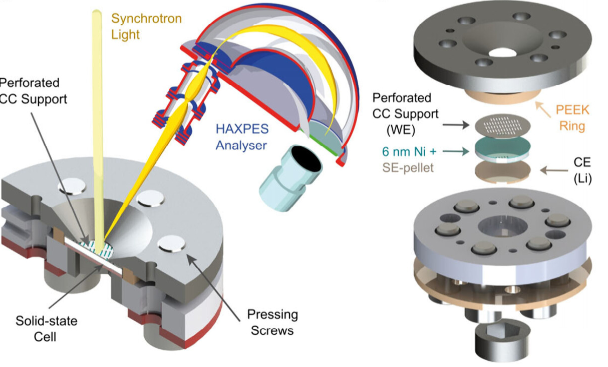 Für die Studie analysierten sie Proben des Festelektrolyten Li6PS5Cl, ein Material, das aufgrund seiner hohen Ionenleitfähigkeit als bester Kandidat für Feststoffbatterien gilt. Dabei arbeiteten sie eng mit dem Team des Batterieexperten Professor Jürgen Janek von der Justus-Liebig-Universität Gießen (JLU Gießen) zusammen. Als Arbeitselektrode diente eine hauchdünne Schicht aus Nickel (30 Atomlagen oder 6 Nanometer). Auf die andere Seite des Li6PS5Cl-Pellets wurde ein Lithiumfilm gepresst, der als Gegenelektrode diente.