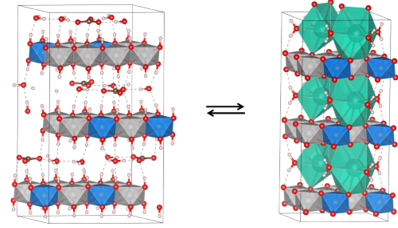 Die katalytisch inaktive alpha-Phase (links) wandelt sich durch einen Phasenübergang zur hochaktiven gamma-Phase (rechts) um. Die chemischen Details dieses Phasenübergangs konnte das Team mit Röntgenexperimenten an der Endstation LIXEdrom des BESSY II sowie elektrochemischen und computergestützten Analysen im Detail aufklären. © Hanna Trzesniowski