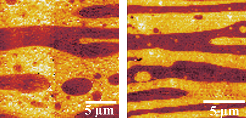 In der Nano-IR-Bildgebung sind die Schichtstrukturen der reinen PVDF/PLLA-Mischung (links) und mit dem SAD-Zusatz (rechts) deutlich unterscheidbar. Die hellen und dunklen Farben entsprechen den PLLA- bzw. PVDF-Phasen. Bei Zugabe von SAD werden die Domänengrößen der beiden Phasen reduziert. © TU Eindhoven/HZB