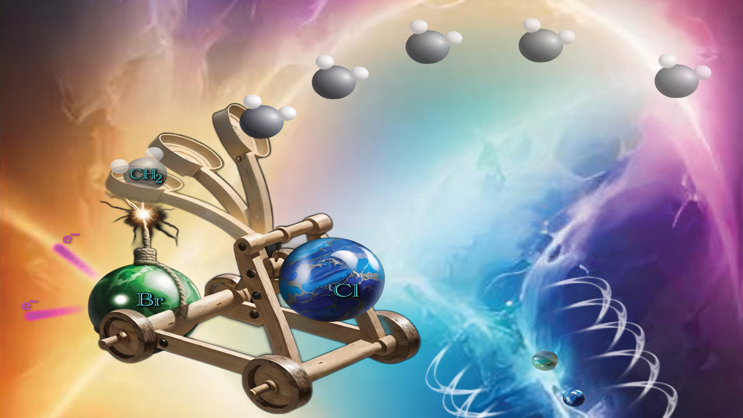 An BESSY II wurde beobachtet, wie Röntgenphotonen einen „molekularen Katapulteffekt“ auslösen: Leichte Atomgruppen werden zuerst herausgeschleudert, ähnlich wie Geschosse aus einem Katapult, während die schwereren Atome – Brom und Chlor – sich deutlich langsamer trennen. Das Bild wurde auf dem Cover von "The Journal of Physical Chemistry Letters" abgedruckt. © The Journal of Physical Chemistry Letters