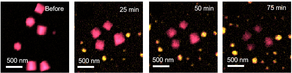 TXM-Aufnahmen von Cu<sub>2</sub>O-W&uuml;rfeln (rosa) und metallischen Kupferpartikeln (gelb) zu unterschiedlichen Zeitpunkten: vor der Reaktion (a), nach 25 Minuten (b), 50 Minuten (c) und 75 Minuten (d). Dazu wurden zeitgleich spektroskopische TXM-Aufnahmen gemacht, die zeigen, wie sich die Kupferverbindungen ver&auml;ndern (siehe auch in der Publikation doi:10.1038/s41563-024-02084-8).