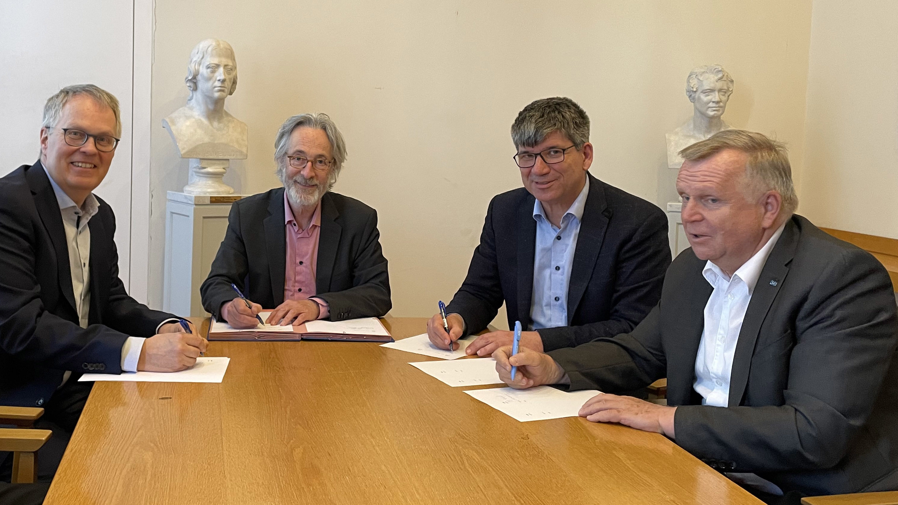 Bei der Unterzeichnung des MoU für ein gemeinsames Berlin Battery Lab am 7. Mai 2025: Prof. Dr. Ulrich Panne, Präsident der Bundesanstalt für Materialforschung und -prüfung (BAM), Prof. Dr. Christoph Schneider, Vizepräsident für Forschung der HU, Prof. Dr. Bernd Rech, wissenschaftlicher Geschäftsführer des Helmholtz Zentrums Berlin (HZB), und Thomas Frederking, kaufmännischer Geschäftsführer des HZB (v.l.n.r.). © Uta Sommer / HU