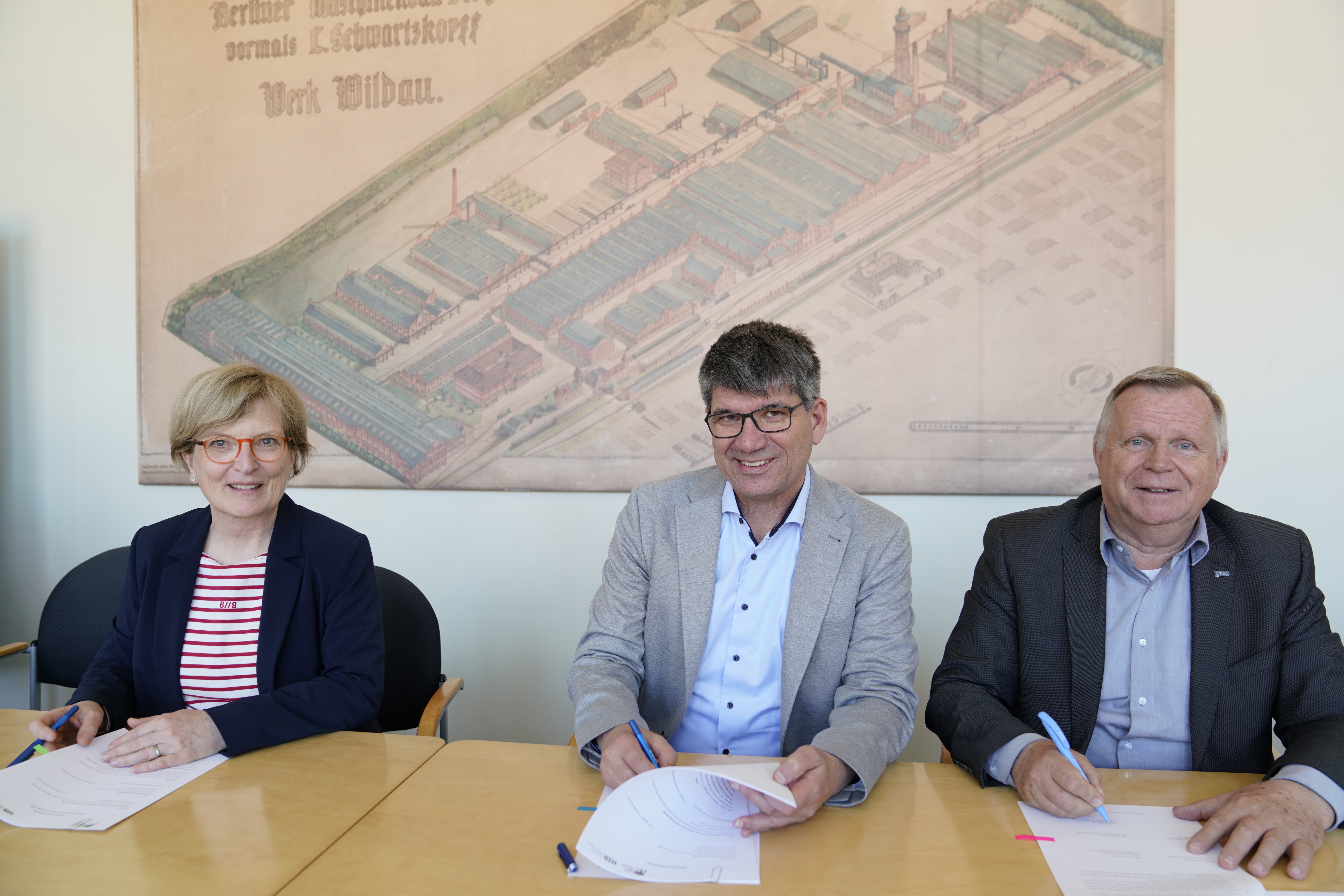 Unterzeichnung des Kooperationsvertrags der TH Wildau, vertreten durch die Präsidentin Prof. Dr. Ulrike Tippe, und des Helmholtz-Zentrum Berlin für Materialien und Energie, vertreten durch den wissenschaftlichen Geschäftsführer Prof. Dr. Bernd Rech (Mitte) und den kaufmännischen Geschäftsführer Thomas Frederking.