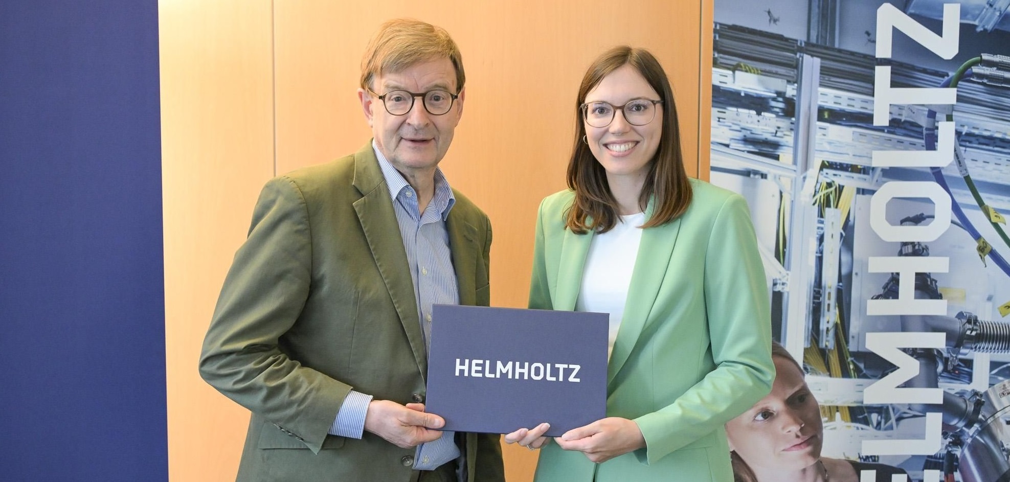 Helmholtz-Präsident Otmar D. Wiestler übergab Hanna Trzesniowski den Helmholtz-Promotionspreis am 8. Juli 2025. © Oliver Walterscheid