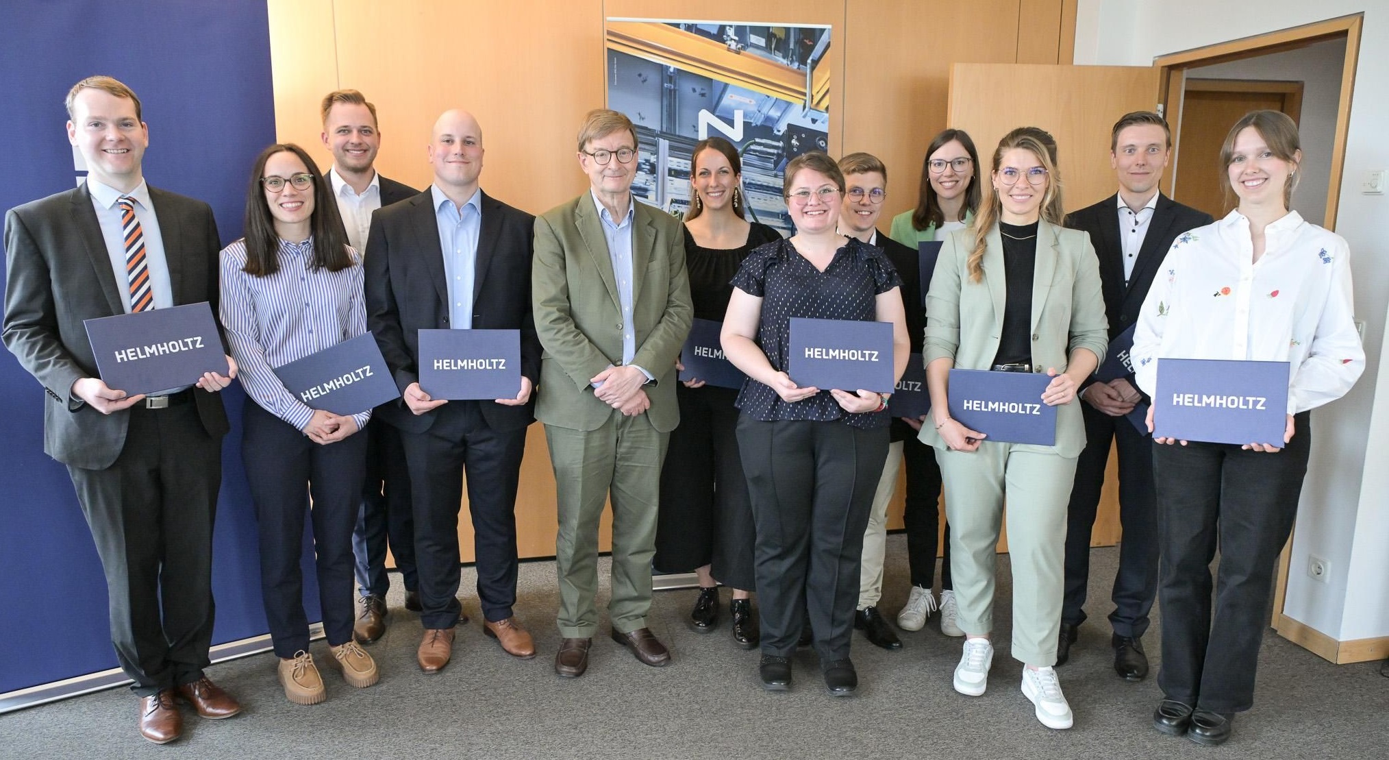 Der Helmholtz-Präsident im Kreise der Promotionspreisträger:innen (v.l.n.r.): Marvin Carl May, Clara Vázquez García, Stephan Hilpmann, Lars Grundhöfer, Otmar D. Wiestler, Laura Helleckes, Monica Keszler, Benedikt Wagner, Hanna Trzesniowski, Celia Dobersalske, Tim Ziegler und Vanessa Stenvers. © Oliver Walterscheid