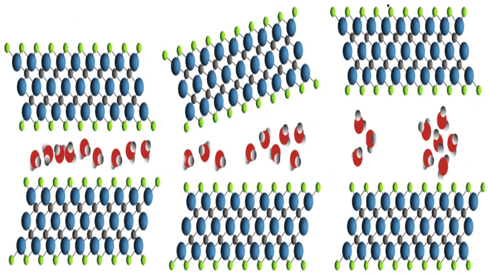 Wasser hat noch immer unbekannte Seiten. Wenn Wasser durch Einschluss in geeignete Materialien in zwei Dimensionen gezwungen wird, entstehen neue Eigenschaften, Phasenübergänge und Strukturen. MXene als Materialklasse bieten eine einzigartige Plattform für die Erforschung dieser Phänomene. MXene bestehen aus Übergangsmetallcarbiden und -nitriden, die eine Schichtstruktur bilden, deren Oberflächen Wasser leicht absorbieren. Zwischen den einzelnen Schichten bildet das Wasser einen sehr dünnen Film.