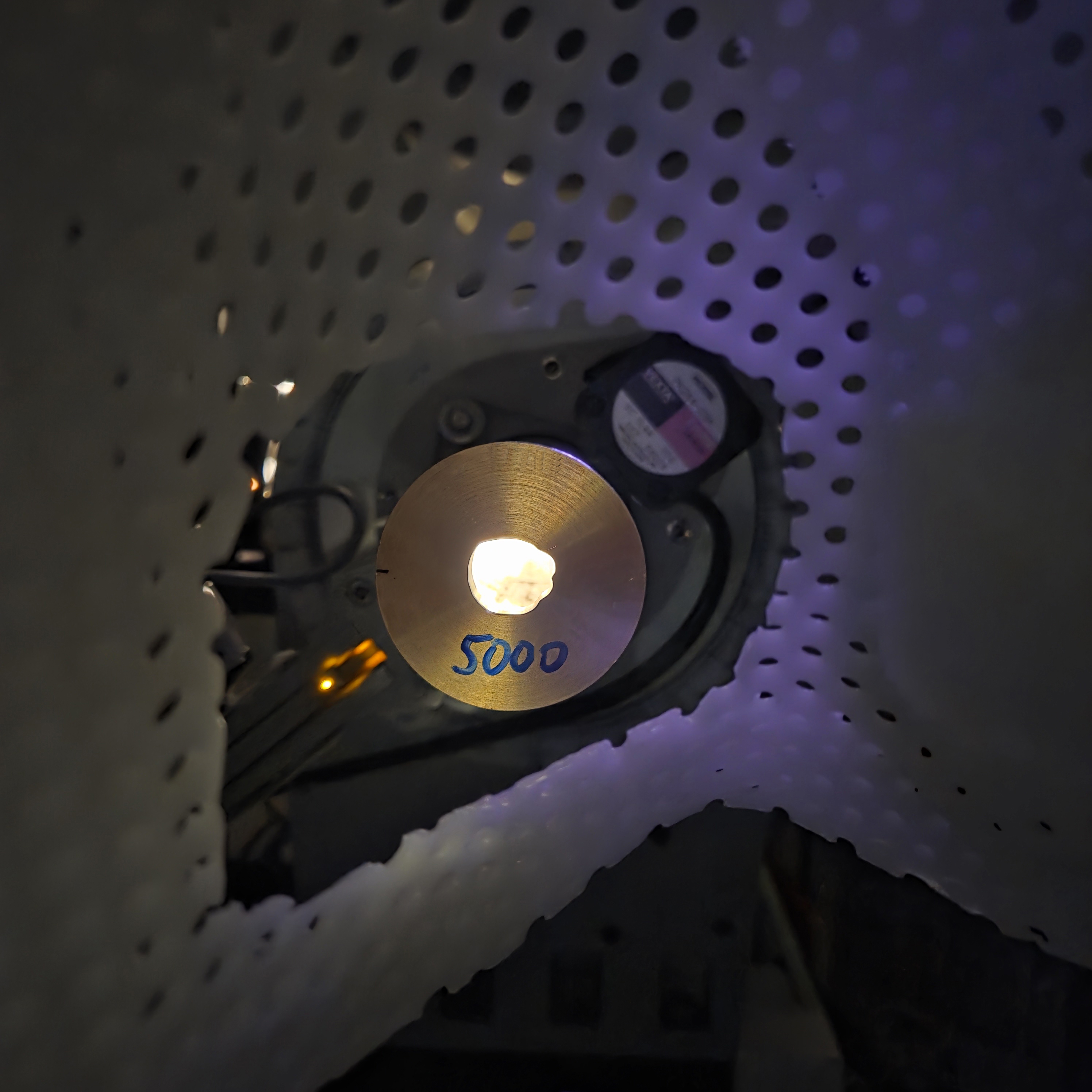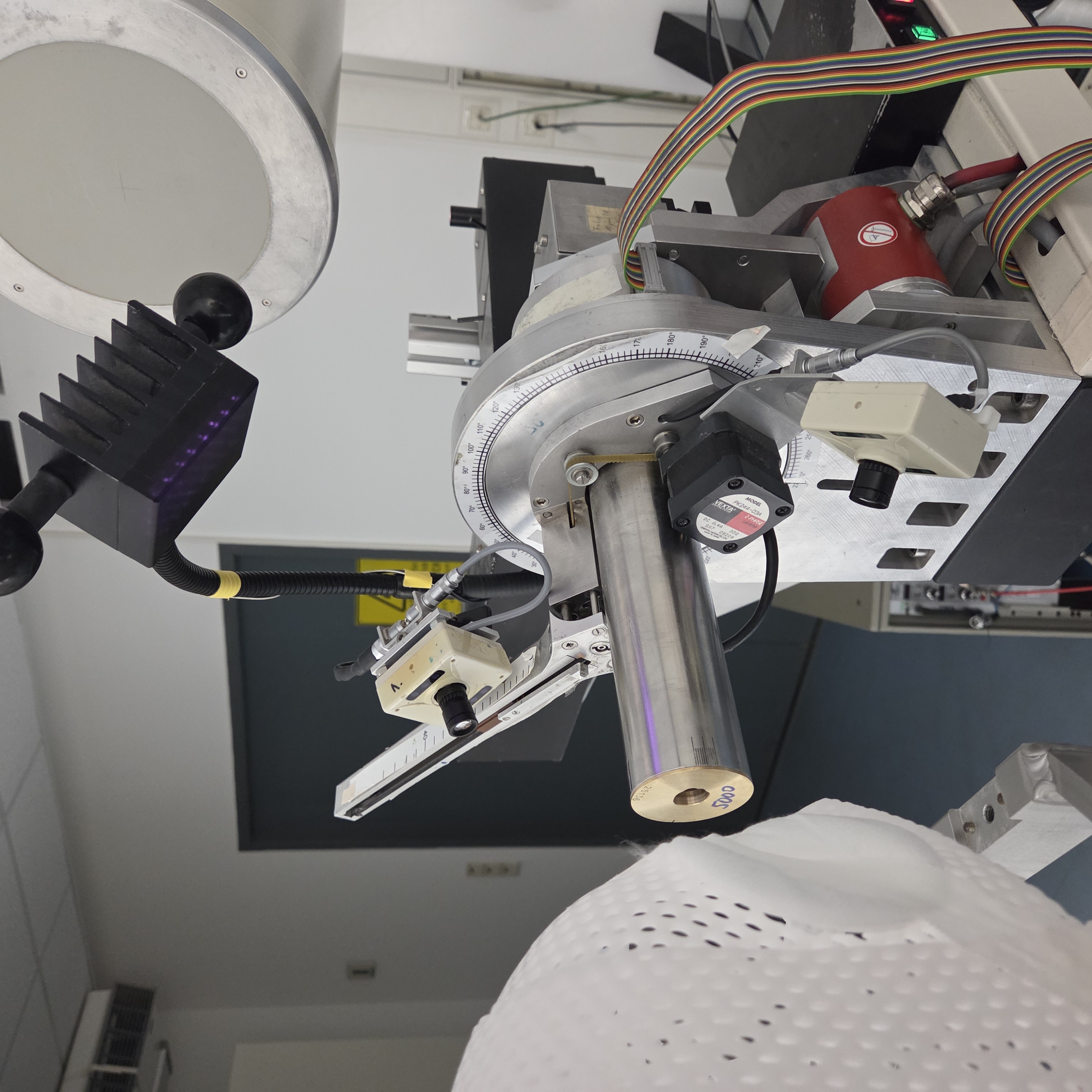 Aus Sicht eines Patienten vom Behandlungsplatz aus: Der Protonenstrahl wird durch das Blendenloch auf den Tumor im Auge gerichtet. Die Messingblende wird auf die individuelle Tumorgröße angepasst und schützt das umliegende Gewebe. © HZB/. S. Kodalle