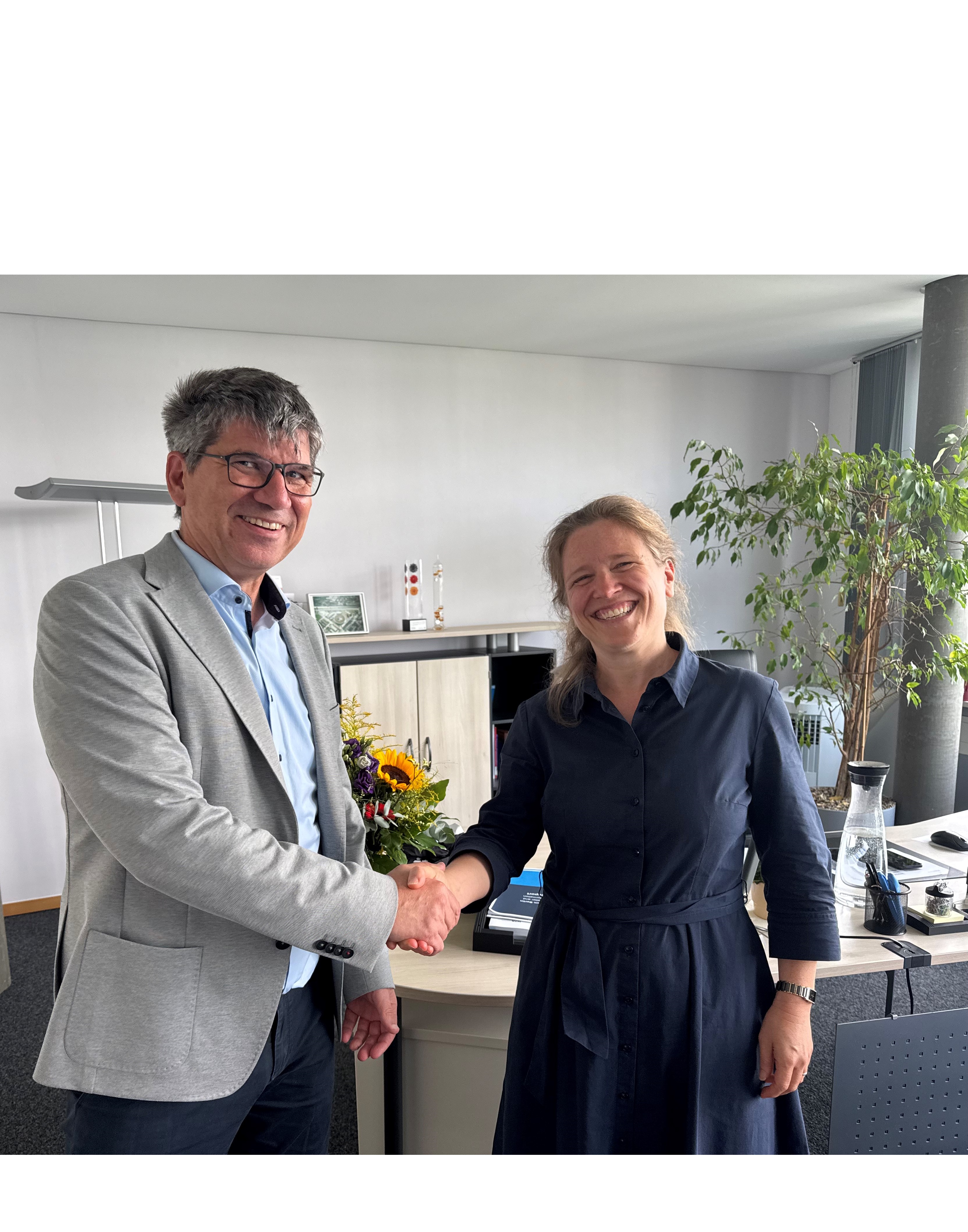Bernd Rech, wissenschaftlicher Geschäftsführer, begrüßt Saskia Vormfelde als neue kaufmännische Geschäftsführerin. Am 1. September beginnen sie ihre gemeinsame Zeit als Geschäftsführungsduo. © HZB