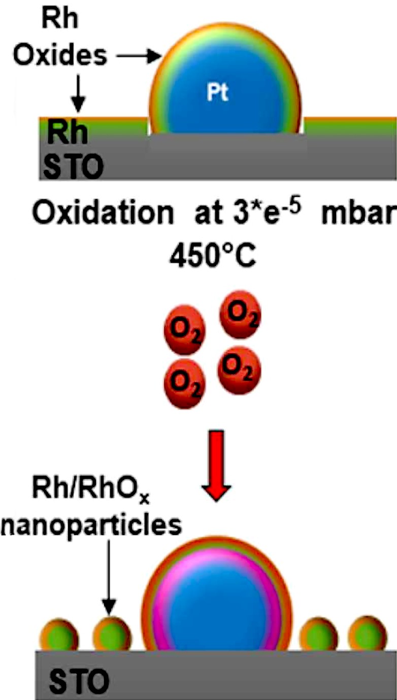 Die Skizze zeigt die Oxidation der Nanopartikel auf dem Substrat aus Strontiumtitanat: Während das metallische Rhodium (grün) sich mit dem Platin (blau) im Kern des Nanopartikels mischt (violett) sowie außen oxidiert (braun), wachsen die kleinen Rhodium Nanopartikel auf dem Substrat zusammen und oxidieren stärker. © Jagrati Dwivedi, DESY NanoLab