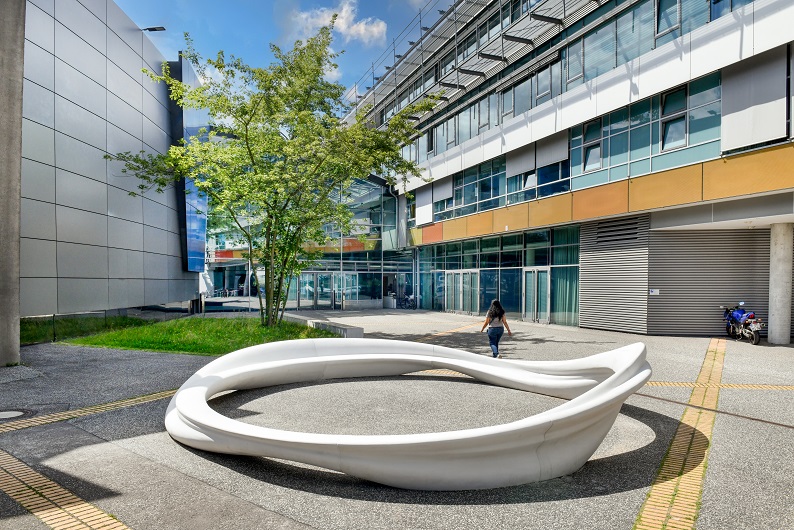 Wissenschaft findet nicht nur hinter verschlossenen Labortüren statt, Geistesblitze ereilen uns überall. Peter Sandhaus gibt schnellen Gedanken nun mit dem »Neuronenbeschleuniger« einen neuen Ort. Während im Inneren Elektronen in einem ringförmigen Tunnel nahezu auf Lichtgeschwindigkeit beschleunigt werden, spiegelt sich die Dynamik des Elektronenspeicherrings in Peter Sandhaus‘ Kunstwerk vor dem BESSY II-Gebäude wider. Der kreisrunde, marmorweiße »Neuronenbeschleuniger« im Eingangsbereich schafft Raum für Begegnungen und lädt zum gemeinsamen Brainstorming ein. Der Künstler hofft, »dass hier wirklich ein Treffpunkt entsteht, der intensiv genutzt wird.«