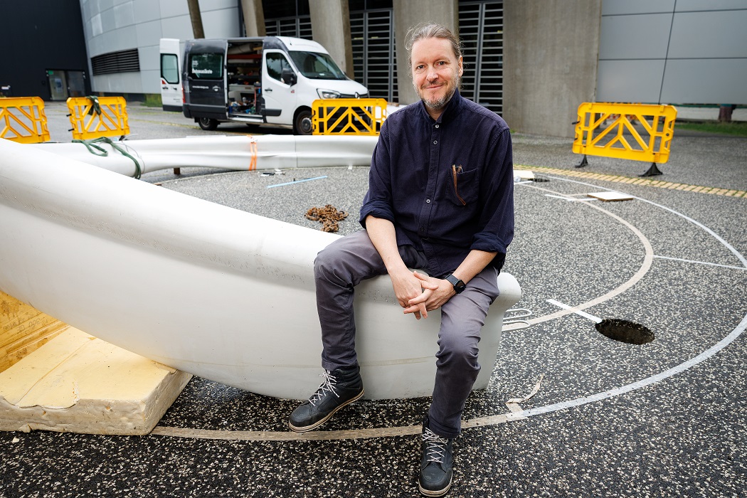 Beim Aufbau wurden dann alle acht Teile zusammengepuzzelt. Als Fundament dienen acht Schraubpfähle. So konnte der Asphalt erhalten bleiben, denn für Fundamente aus Beton hätte dieser großflächig entfernt werden müssen. Dann wurden die Betonfertigteile mit schwalbenschwanzförmigen Verbindungen ineinandergeschoben und vergossen. Außerdem wurden die notwendigen Dehnungsfugen mit Silikon geschlossen. Nun ist das bis zu 1,30 Meter hohe Kunstwerk fertig. Auf der geschmeidigen Oberfläche sitzt man selbst nach Regen gut, denn die Oberfläche ist hydrophobiert und mit einem Algenschutzmittel imprägniert. Mit der Zeit wird der »Neuronenbeschleuniger« eine natürliche Patina entwickeln. Die Ideen aber, die dort entstehen, werden glänzen und zu weiterem Fortschritt beitragen.